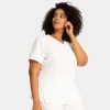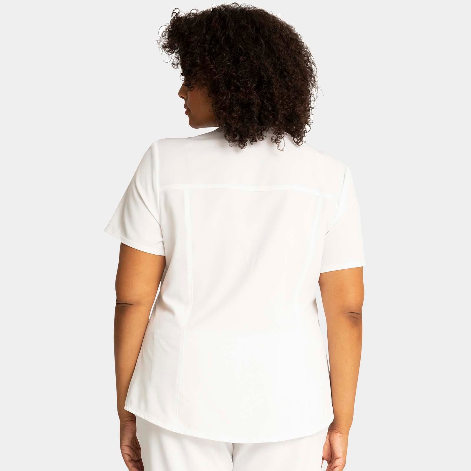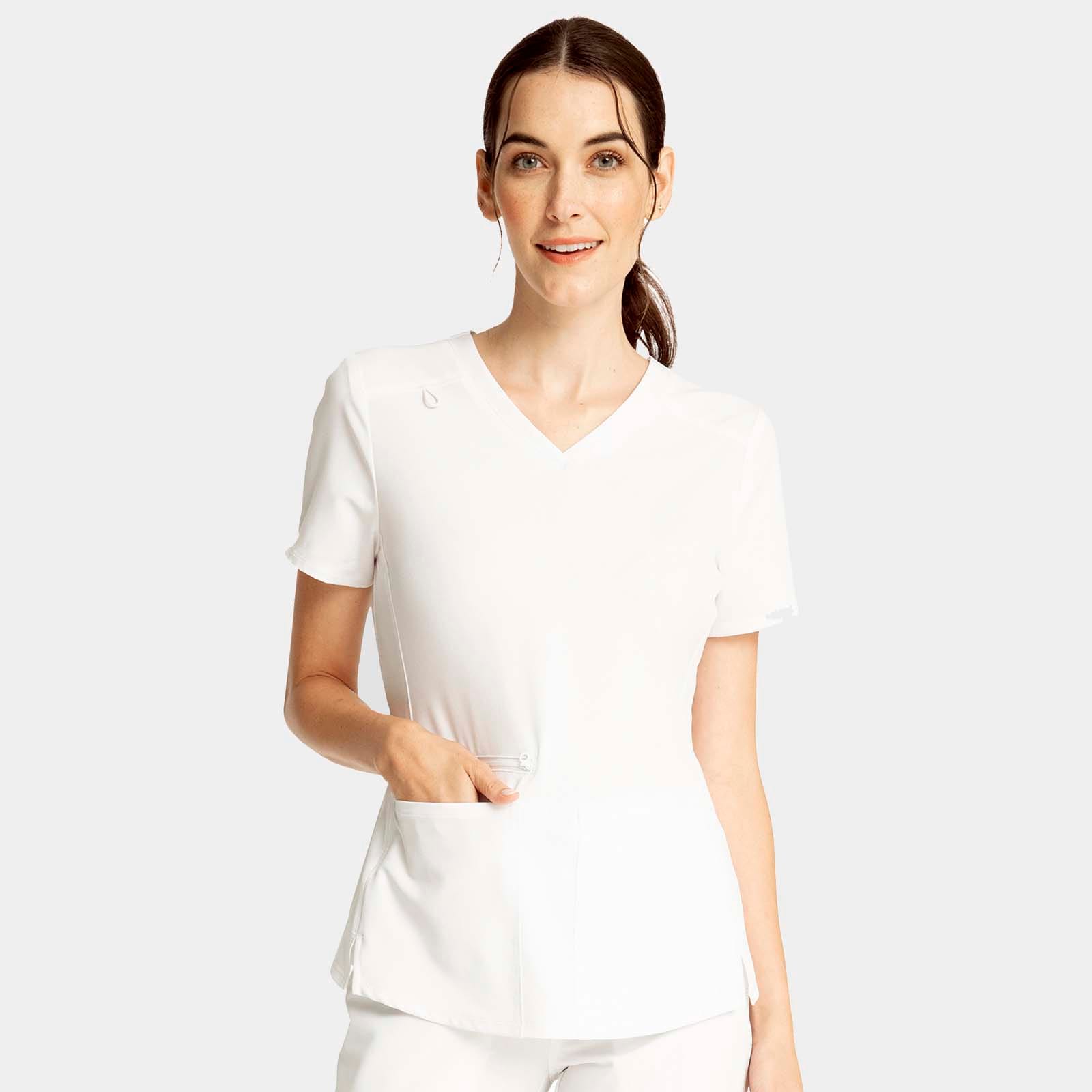 This Contemporary fit V-neck top has front and back yoke seams and a bungee ID badge loop at the right front yoke. Other features include front and back princess seams, front side panels, side vents and a shirttail hem. There are three pockets: two front patch pockets and one zip cell phone pocket. Center back length: 26″